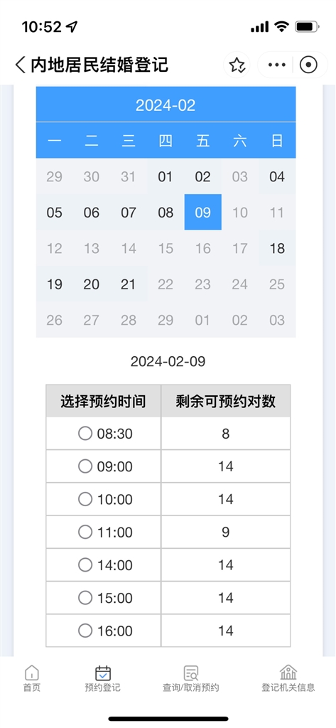 小编通过查询“浙里办”app“浙有姻缘”,选择舟山任一婚姻登记处,发现“2月9日”显示为可点击的黑色字体,表示当天可进行预约,且仍有不少剩余可预约名额。