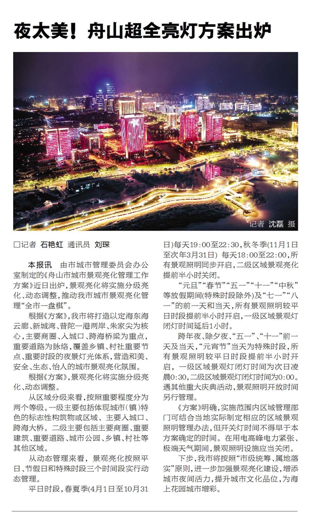 《舟山市城市景观亮化管理工作方案》近日出炉,我市将打造以定海东海云廊、新城湾、普陀一港两岸、朱家尖为核心,主要商圈、入城口、跨海大桥为重点,营造和美、安全、生态、怡人的城市景观亮化氛围(《舟山晚报》1月17日报道)。打造不夜城、点燃夜生活,岛城更将魅力四射。