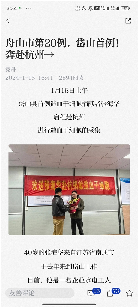 1月15日,岱山首例造血干细胞志愿者张海华赴杭捐献。1月19日中午,张海华历经5个小时,成功捐献323毫升造血干细胞混悬液,帮助一位血液病患者战胜病魔。
