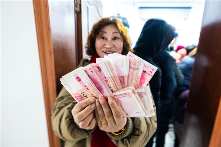 1月22日,嵊山镇泗洲塘村村民方小绒顶着寒风,兴高采烈来到村委会,领取到了自己一家今年的分红。数着手中的3500元现金,方小绒脸上是止不住的笑意:“太好了,村集体又给我们发‘压岁钱’了!村里的共富工坊真是棒棒的!”
