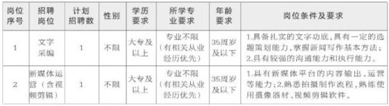 舟山传媒文化有限公司因事业发展需要,面向社会公开招聘2名工作人员(劳务派遣性质),具体要求如下: