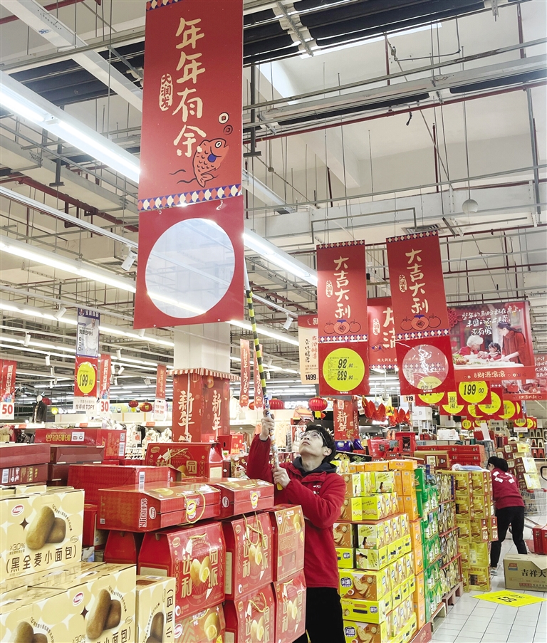 昨天,我市一家大型超市内,工作人员正在悬挂“年年有余”广告牌,商场被布置得红红火火,各种货品琳琅满目,喜庆的年味扑面而来。