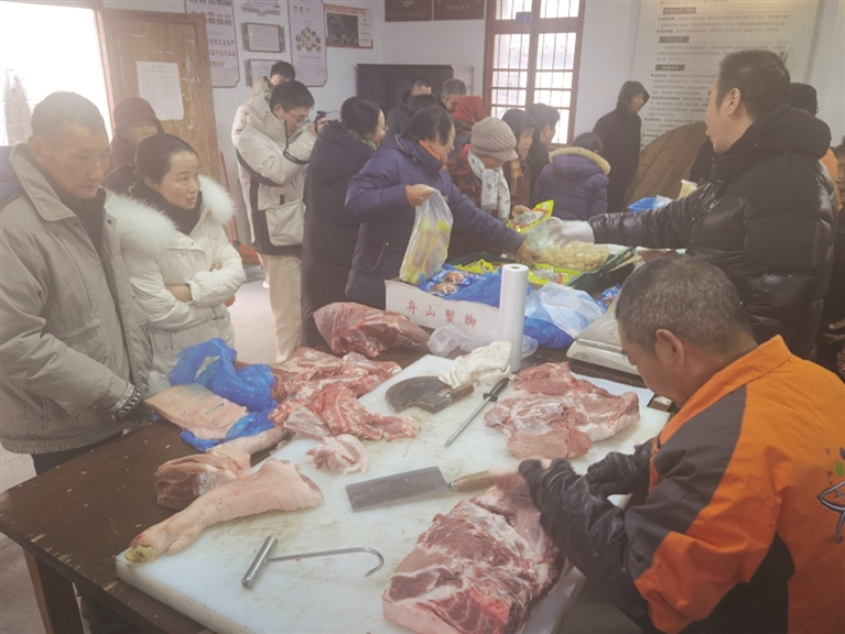 71岁的傅养彩拉着老伴也买了2刀肉、3只蟹,还有酒水等。两份肋条肉他就花了200多元,原本他们计划去三农农产品批发市场采购的。“现在门口好买,再好不过了。阿拉打算腊月十八谢年,谢年东西统要准备起来嘞!”