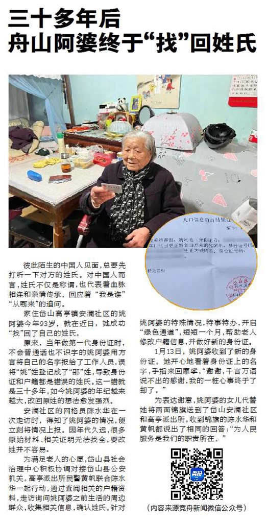 家住岱山高亭镇安澜社区的姚阿婆今年93岁,最近成功“找”回了“丢”失30多年的姓氏,将别人家的“邵”改正为自己的“姚”。