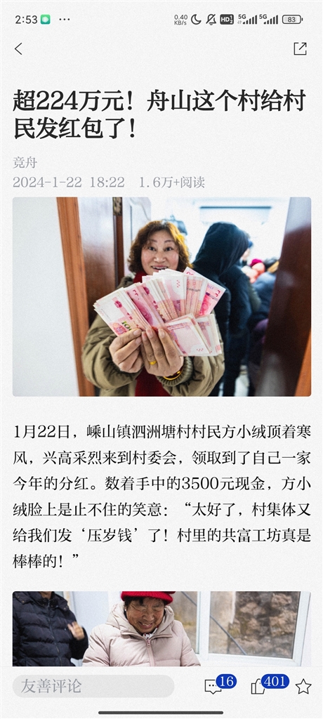 村民方小绒笑逐颜开地数着3500元现金,看着这样的画面谁不怦然心动。嵊泗县嵊山镇泗洲塘村已连续第七年为村民分红,这次3174名村民一共可分224.35万元,真让人羡慕。