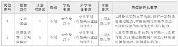 舟山传媒文化有限公司因事业发展需要,面向社会公开招聘2名工作人员(劳务派遣性质),具体要求如下: