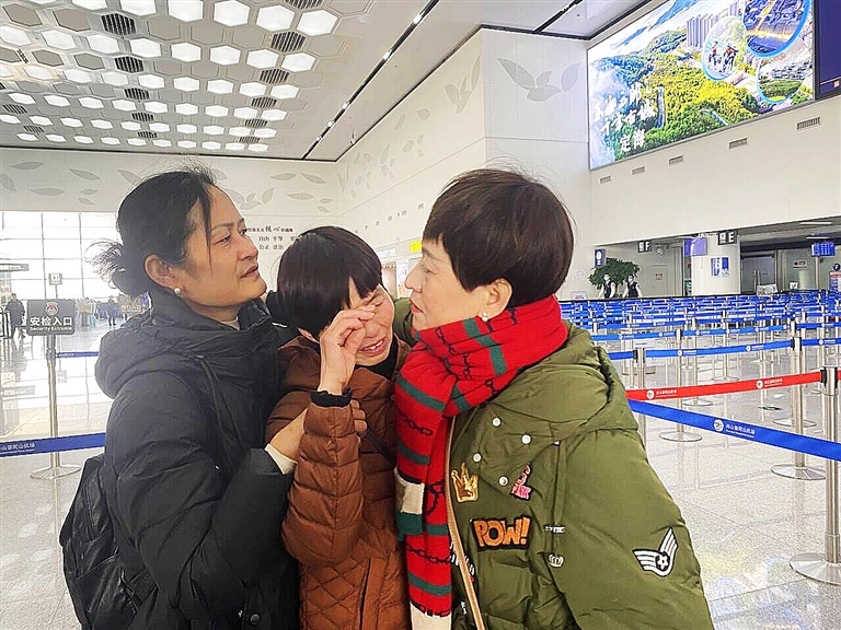 来自四川自贡的吴军一行人正和亲友拥抱告别,年长的女性们纷纷红了眼眶 记者 何菁 摄