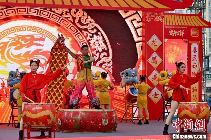 第十六届宜昌·西陵庙会26日开幕,今年以“龙腾盛世 潮涌西陵”为主题,为市民送上一场集文脉、潮玩、嗨购等多主题于一体的惠民大戏。湖北省宜昌市西陵区位于长江三峡西陵峡口。公元1036年,欧阳修被贬到宜昌任夷陵县令,其诗作《夷陵岁暮书事呈元珍表臣》描绘了春节前夕歌舞祭祖先、庆丰年、迎新年的三峡节俗。图为在庙会上演的音舞诗画节目,年轻人是主角。中新网 图
