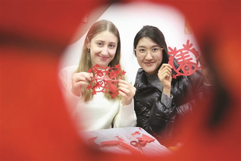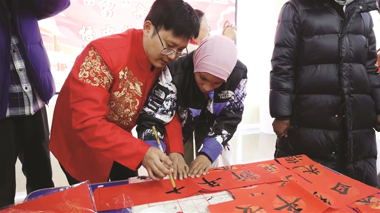 在传统文化体验环节,书法老师教留学生们写了一个个寓意着幸福吉祥的福字,并向他们表达了迎春纳福、追求美好的希冀。