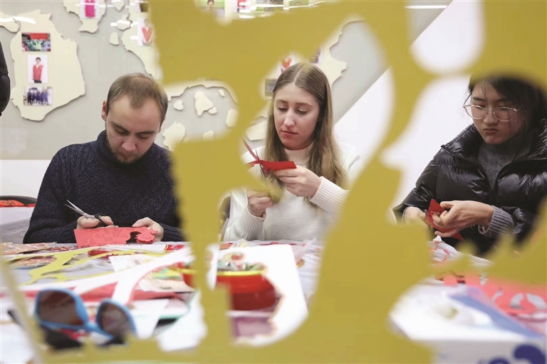 近日,浙江海洋大学的留学生们受定海区新时代文明实践中心邀请,参加了一场富有春节特色的体验活动,来自7个国家的11名留学生跟随民间艺人学习中国传统技艺,感受中国传统文化的魅力。