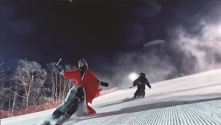 在他们的视频中,最受欢迎的是锦衣卫系列。只见大家身着黑色服饰,手握佩刀,从白茫茫的雪道上飞速滑过,仿佛锦衣卫们在进行一场夜色下的决斗,“很多成员都是滑雪教练,他们白天要给学员们上课,晚上才有时间拍摄。加上晚上滑雪场的灯光效果较好,所以我们一般都是夜滑。”狼叔介绍,天黑了雪场温度会更低,最冷的时候,大家在零下35摄氏度的气温下拍完了视频,“那次真的冻得什么感觉都没有了!”不过,那是比较极端的情况,绝大多数室外温度都在零下十几摄氏度,“拍的时候会感觉冷,但看到成品视频后会觉得热血沸腾。”
