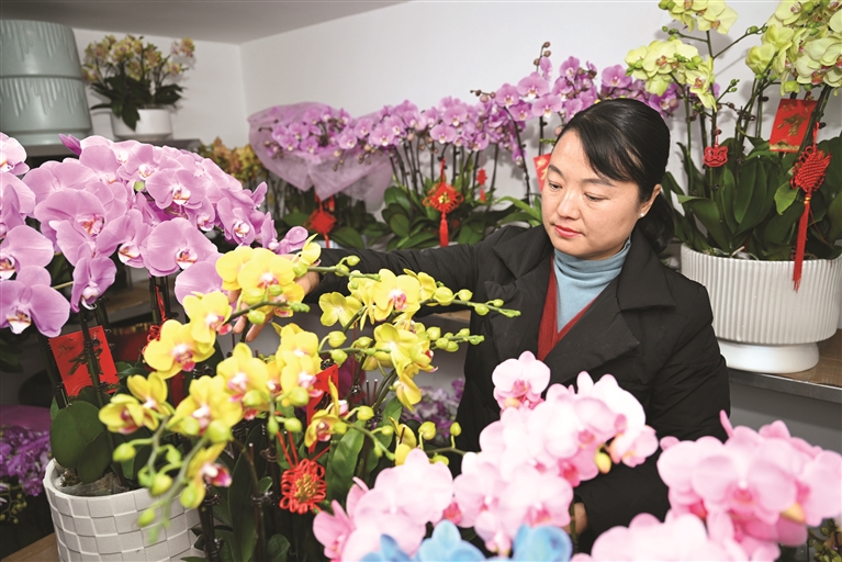 1月23日,记者来到位于定海的醉爱泥工艺品有限公司,典雅精致的蝴蝶兰、红果累累的冬青、雍容华贵的大花蕙兰……各色各样的年宵花竞相开放,牢牢占据了C位,搭配上带有龙年元素图案和冬青作为点缀,喜庆又美观。