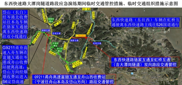 管控措施:除演练车辆和人员,禁止其他车辆、人员进入管控路段。岱山(长白)经S6定岱高速岑港北收费站往本岛的车辆,在东西快速路骆家互通下行匝道往双小线分流绕行。