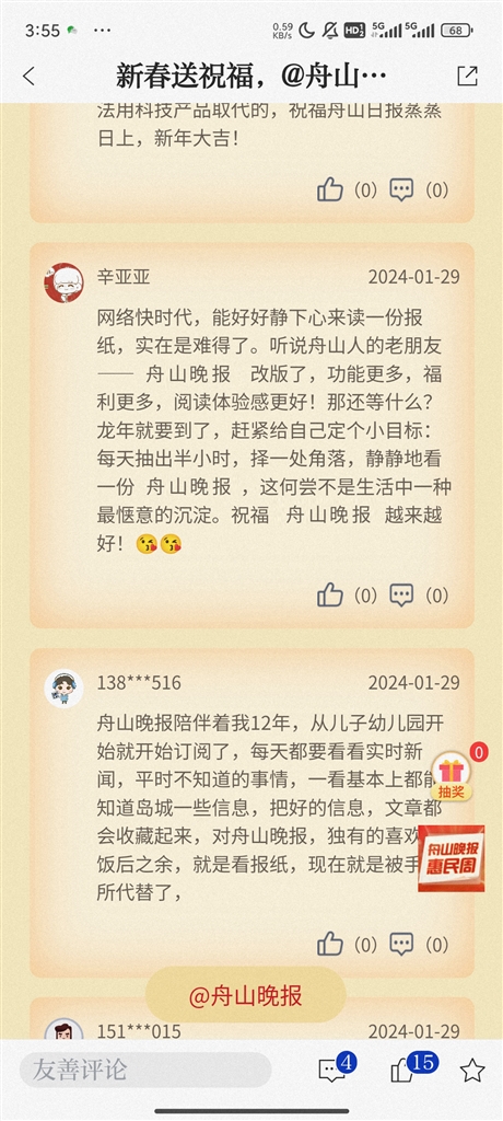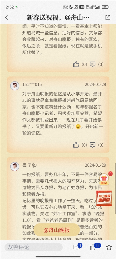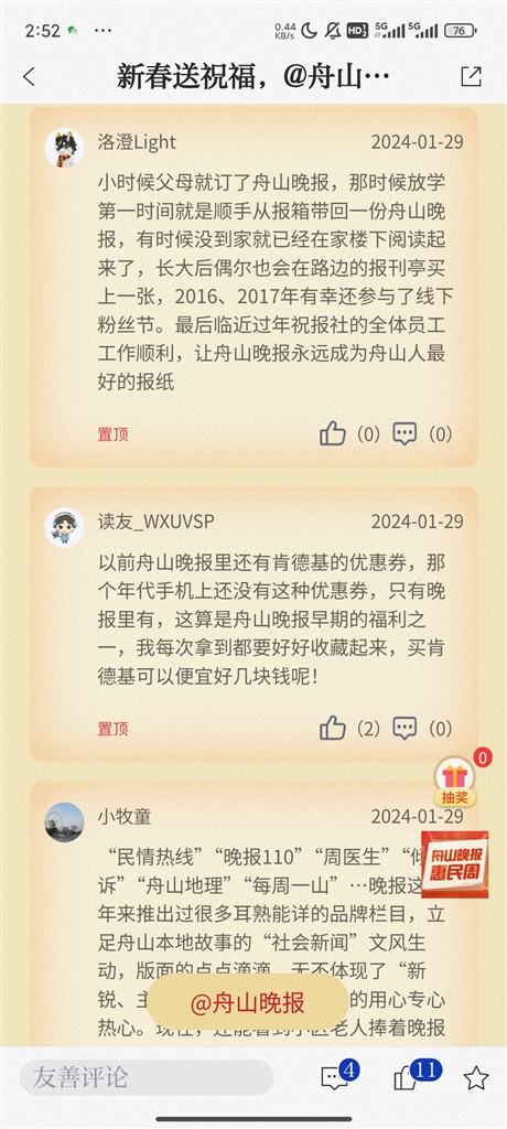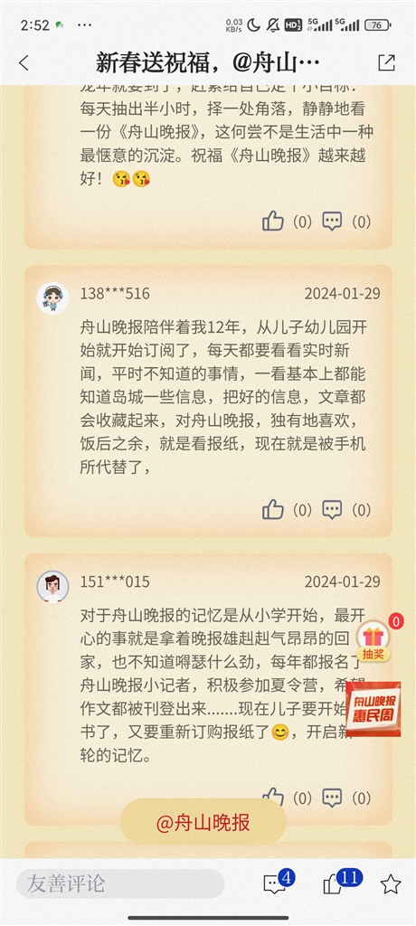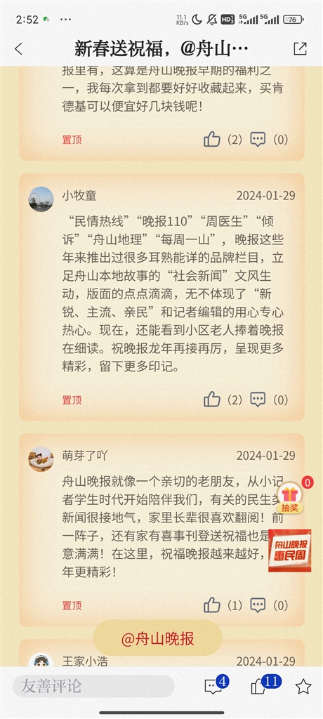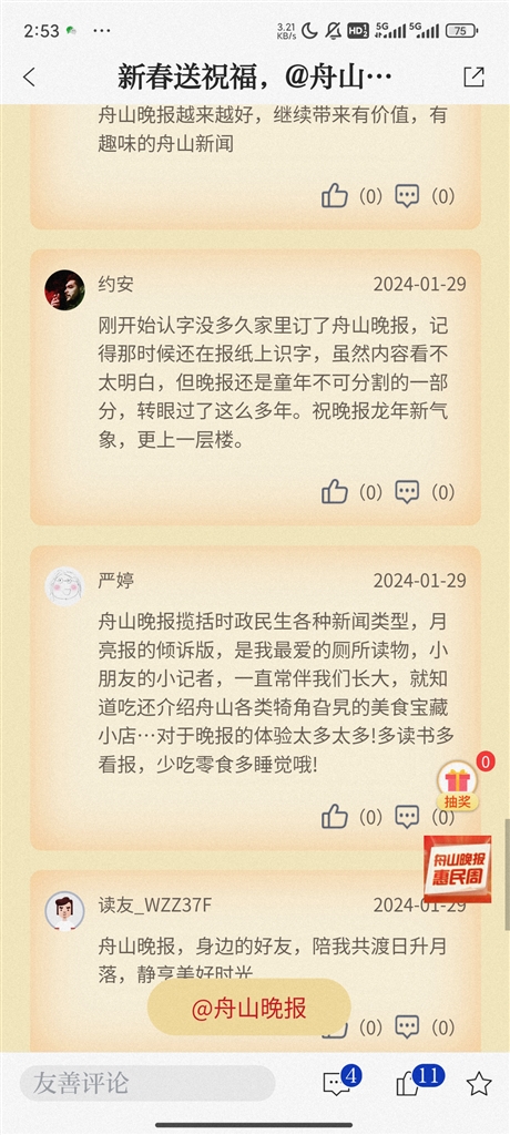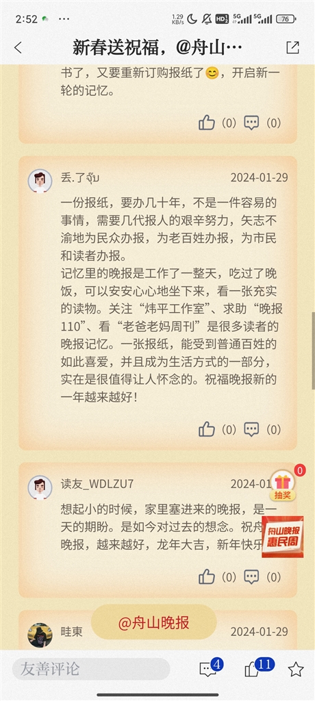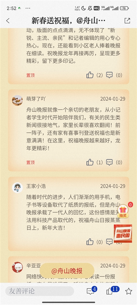 即日起至2月4日,登录“竞舟”APP,点击首页晚报惠民周活动,参与互动留言,就有机会抽取我们为您准备的新春好礼。