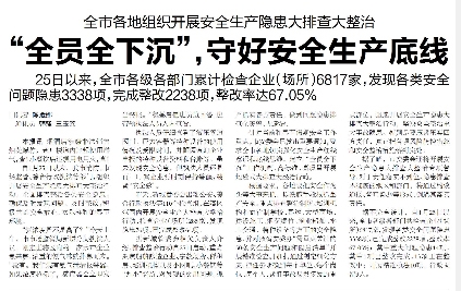 我市消防、市场监管、综合行政执法等部门,组织开展安全生产隐患大排查大整治行动,25日以来已累计检查企业(场所)6817家,发现各类安全问题隐患3338项,完成整改2238项,整改率达67.05%(《舟山日报》1月29日报道)。安全生产就要反复抓、抓反复,年关临近更要力求隐患清零,为欢乐春节打牢平安底色。