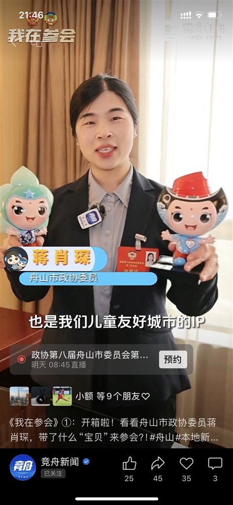 这是我今天带来的两个吉祥物,也是建设儿童友好城市的IP——海娃和海妮。他们张开双臂,拥抱大海,象征着舟山的少年儿童朝气蓬勃、自信活泼的形象,非常受孩子们的欢迎。舟山自2022年开始建设儿童友好城市,希望通过我们的努力,能深化儿童友好的理念和内涵,为在舟来舟的孩子们,提供更加适宜成长的环境、条件和服务。这两个IP就代表了我们的心声,希望孩子们在舟山都能有一个幸福健康的成长环境。