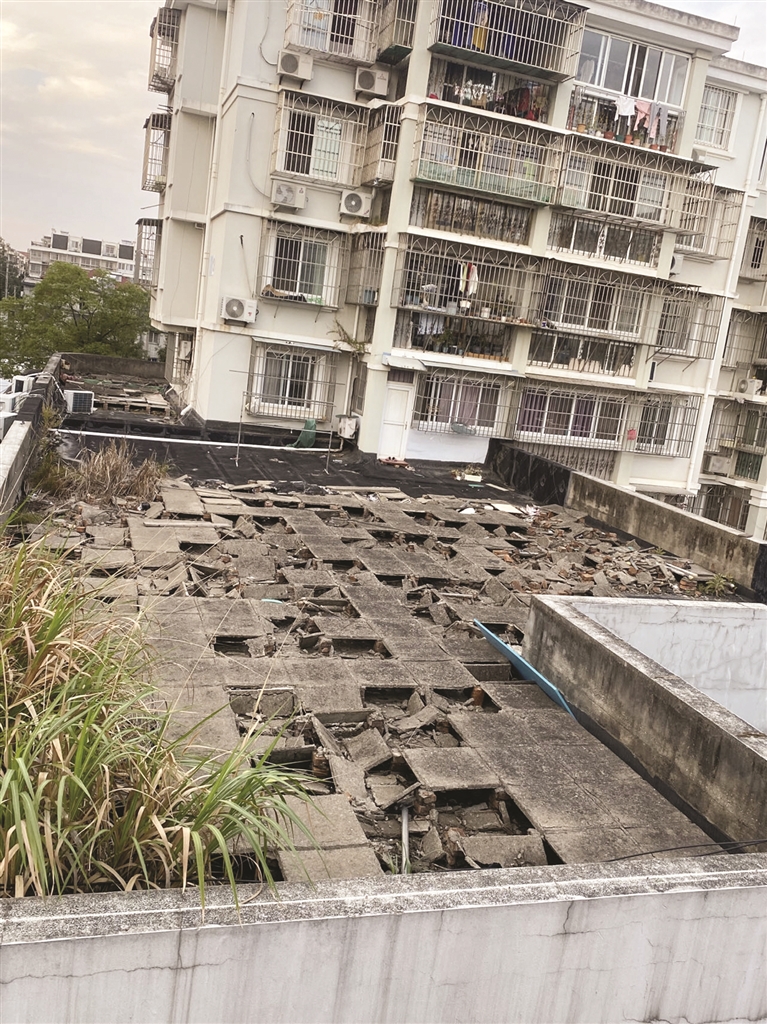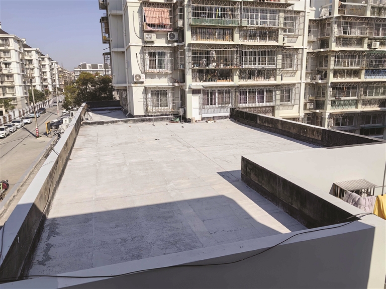 在余林林的手机相册里,有不少照片记录了小区过去的样子。一张照片上,一处矮楼的天台,石板长满青苔破败不堪,角落还丛生着茅草。可如今从小区内社区办公处三楼楼道窗户往外看去,这处天台已被修缮一新,平整而宽敞。