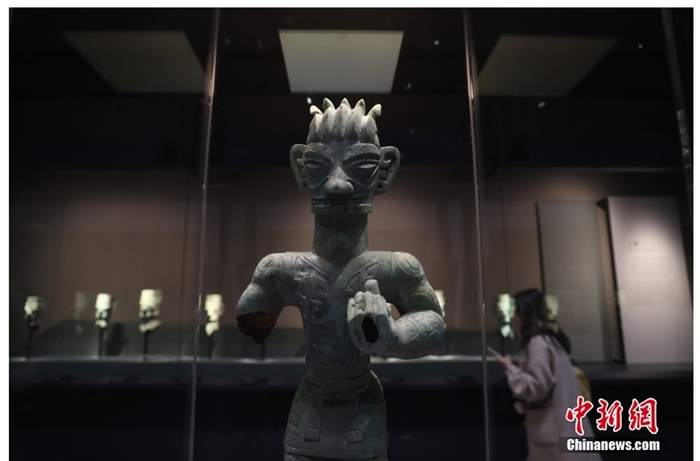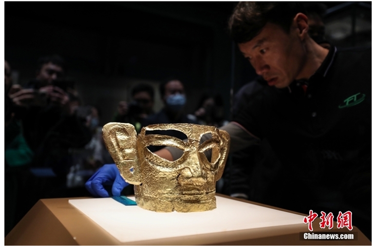 1月29日,上海博物馆东馆开馆首展“何以中国”文物考古大展系列第三季“星耀中国:三星堆·金沙古蜀文明展”加紧布展,重要展品“金面具”和“竖披发青铜人像”先后开箱,放入展柜。据悉,本次展览共计展出363件/套文物,是古蜀文明考古出土文物在四川省外最大规模的展览。图为展品“金面具”和“竖披发青铜人像。 中新网 图
