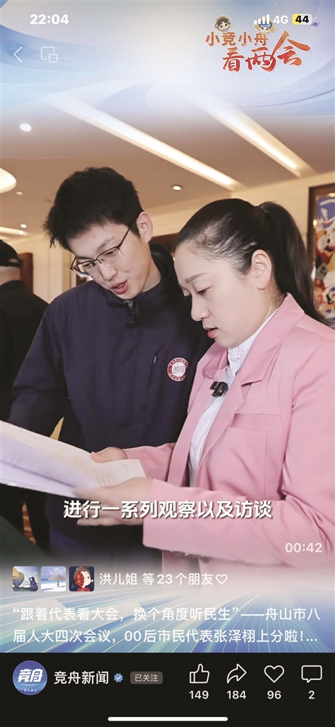 我是来自中共浙江省委党校马克思主义理论专业的硕士研究生。同时,我也是一名土生土长的舟山普陀学子。就在前几天,我有幸作为00后观察员参与了省两会的系列活动。这也是我第一次走进市两会的报到现场。这几天,我主要跟着市人大代表、市民宿协会会长丁薇薇进行一系列观察以及访谈。
