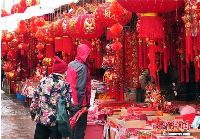 近日,随着春节临近,广西南宁市年货市场“红红火火”,民众采办年货的热情高涨,“年味”越来越浓。在南宁市江南区淡村商贸城等年货集市,包装喜庆的年货礼盒琳琅满目,年画、挂历、灯笼、对联等节庆用品销售火爆。 中新网 图