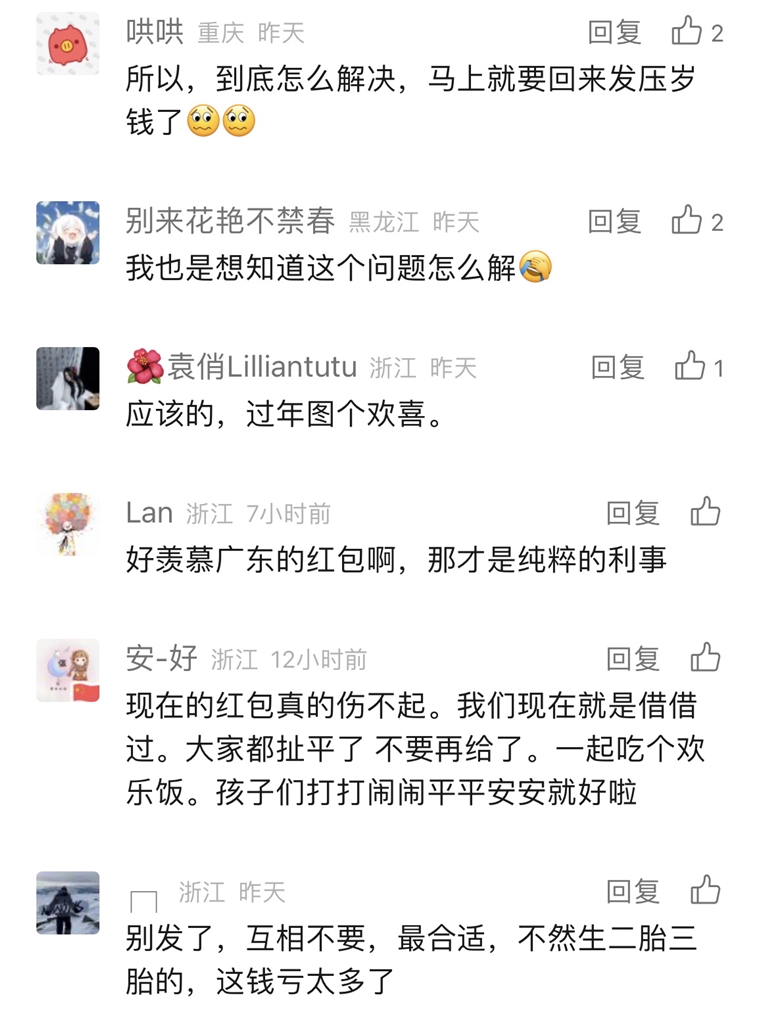 对此,舟山人“平头哥”认为,红包只是一种人情往来,没必要争个“高下”。“舟山人有句话,叫‘借借过’,意思就是相互扯平了,其实红包交换来交换去,并没有多大意思。如果觉得包红包的压力很大,不如量力而行。”