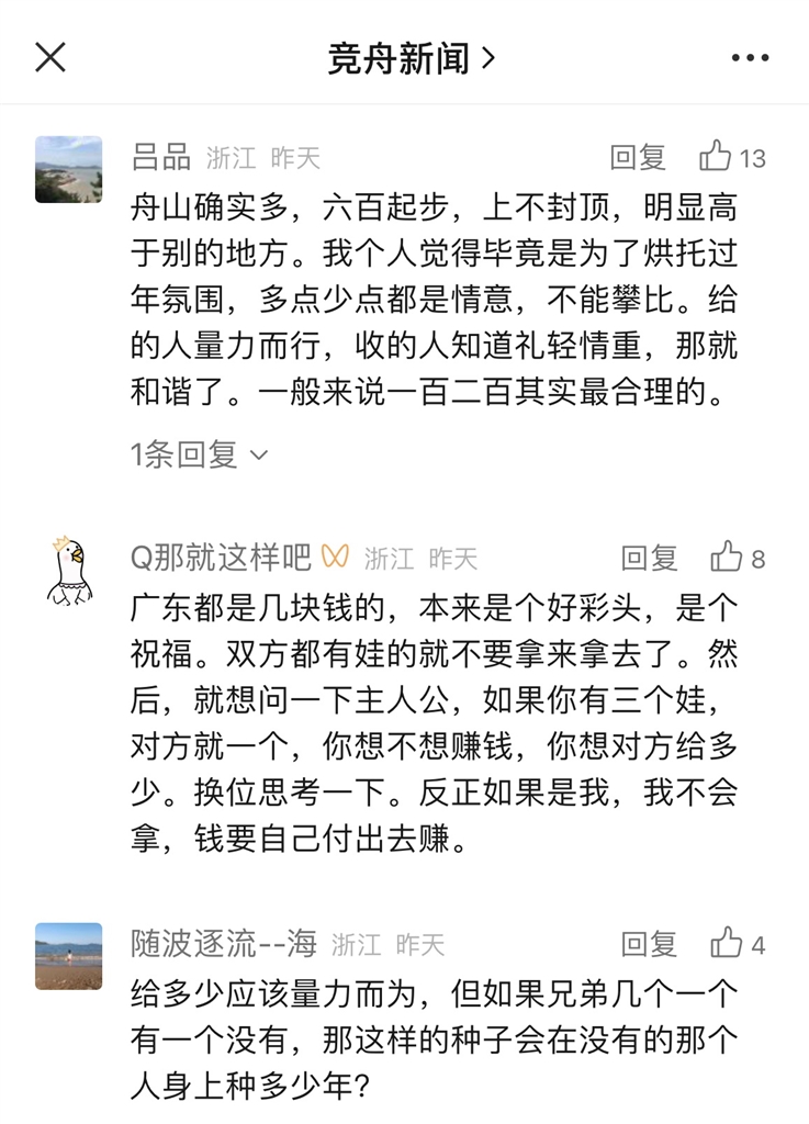 在竞舟新闻微信公众号关于红包的相关话题下面,许多网友分享了看法。