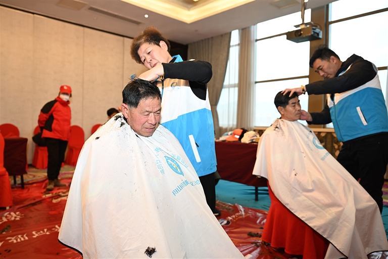 昨天下午2点多,宴会厅已经热闹起来了。橙衣天使们陆续到场,在场的志愿者也忙活起来,为他们提供免费理发、配老花镜等服务。