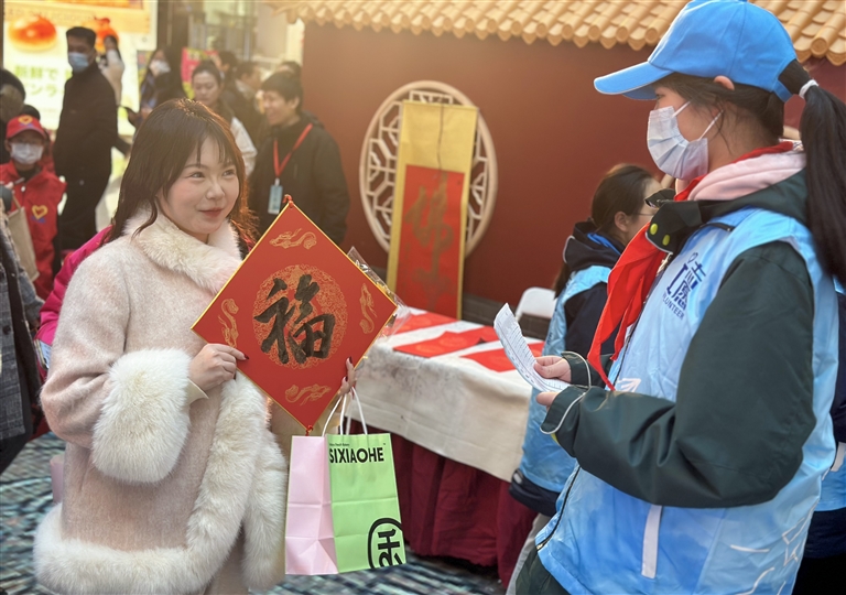 日前,舟山一初组织学生开展“迎新春·写福字·送祝福”寒假社会实践活动。在宝龙广场活动现场,同学们挥毫泼墨书写福字,市民从同学们手中接过“福”字满心欢喜。记者 沈磊 通讯员 朱盼盼 摄