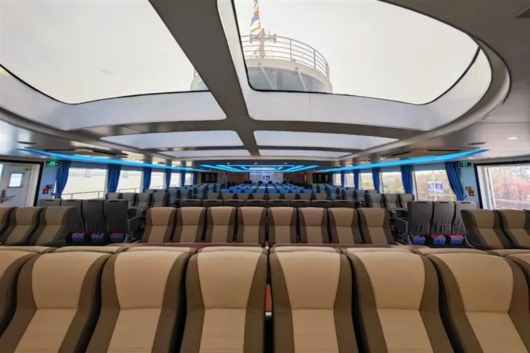 “普陀皓云”轮是目前普陀环岛客运最大的一艘滚装客船,钢铝复合结构,总长66.51米,型宽15米,型深4.5米,采用双机双桨推进,设计航速16节,具备22个标准车位(约45辆小型客车),核定载客340人,抗风等级为9级,具有良好的抗风浪能力及适航性。该船视野开阔、布局合理,电梯实现人车分离,最大幅度满足旅游客运需求。