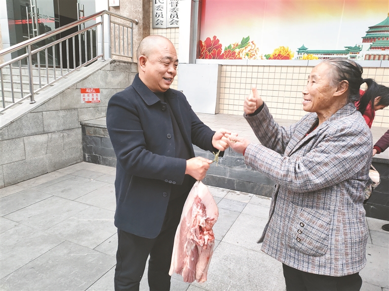 几天后,杨守彬买下一头接近400斤重的大肥猪,与当地干部一起将猪肉送到18户困难老人手中。