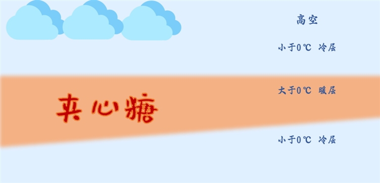 也就是说,冻雨的形成需要有一个特殊的大气层结,有点像夹心糖一样,从上而下大气层的分布是冷—暖—冷的状态。