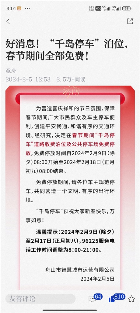 舟山公交春节免费,正月初一还开通免费祭扫专线。“千岛停车”道路收费泊位及公共停车场春节期间同样免费,2月9日(除夕)8:00开始至2月18日(正月初九)8:00结束,可以让大家“想停就停”。这样的免费,营造了欢乐祥和的节日气氛,释放了公共服务的民本情怀。