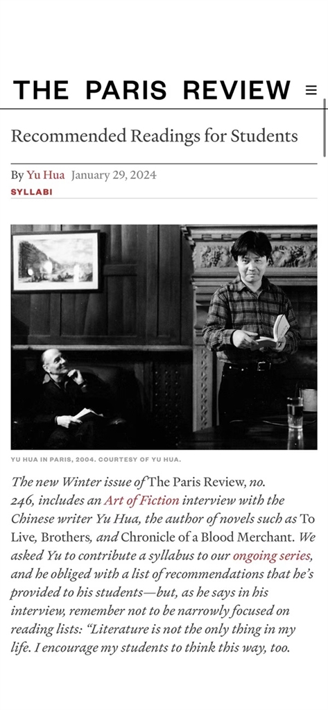 《巴黎评论》的“文学课程推荐目录”也会邀请接受过访谈的作家、诗人推荐读物。“我们邀请余华为我们正在进行的系列报道提供一份目录,他答应了我们的请求,并提供了一份他给其学生的推荐读物。但正如他在访谈中所说,切记不要狭隘地只专注于阅读书单:文学不是生活中的唯一。”