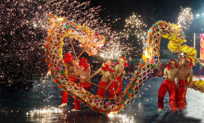 2月7日晚,四川省达州市举办2024年达州迎新春非遗大巡演活动。来自达州市达川区石桥镇和开江县甘棠镇的8条火龙轮番上阵PK,进行非遗火龙竞演。中新网 图