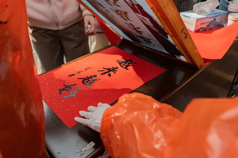 已经获得了新春丝印的游客们,脸上则洋溢着笑容,跟这幅充满年味、充满希望的字来个新年合影。