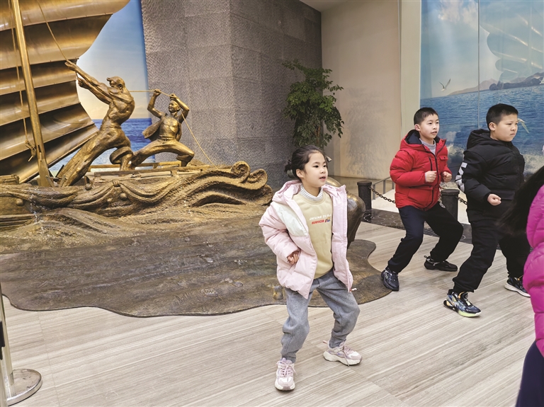 王胥欢在红包上寻找着年味,二年级的周咨含则走进舟山图书馆,在这里邂逅了本土的新年模样。“我们小时候过年很热闹,元宵节还有踩高跷的活动,但是现在的小孩很少有机会感受这些。”周妈妈看到舟山图书馆的新年活动后,干脆就带着女儿直奔图书馆找年味,跟着师傅学舟山船拳。