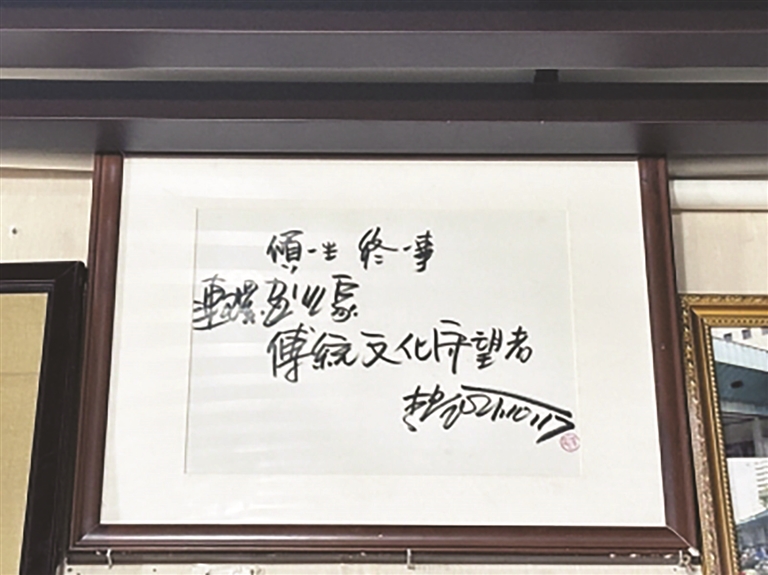 刘高的店里有不少字画,其中“倾一生,终一事,传统文化守望者”是别人送给他的一句评价,被他珍藏在店中,作为自己的信念一直延续下去。