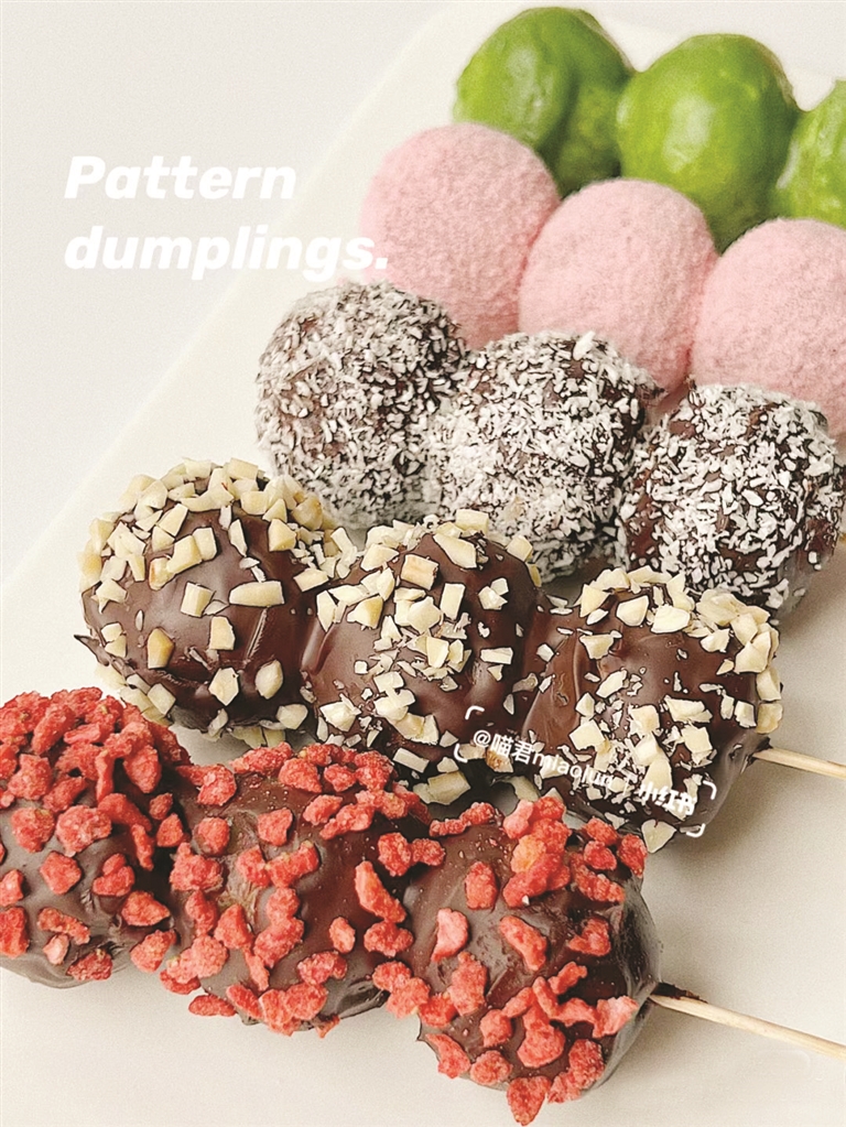 而在网络社交平台上,网友们对于做熟汤圆的创意还有很多。如小红书网友“喵君miaojun”就尝试将煮熟的汤圆串成一串,冷冻后裹上巧克力酱并蘸取花生碎、椰蓉、冻干草莓颗粒等小料,传统汤圆变身成了日式串团子。