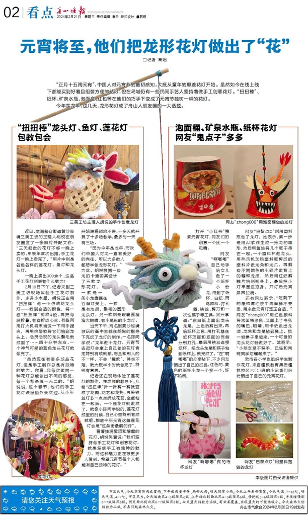 元宵佳节即将来临,又恰逢龙年,龙形花灯成为了舟山市民热议的话题。在这个传统节日里,花灯不仅是节日氛围的点缀,更是承载了人们对于美好生活的祈愿和对于传统文化的热爱。最近朋友圈屡屡晒出手工制作的花灯,让传统节日焕发出新的活力,展现了传统手工艺在节日中的创新传承。