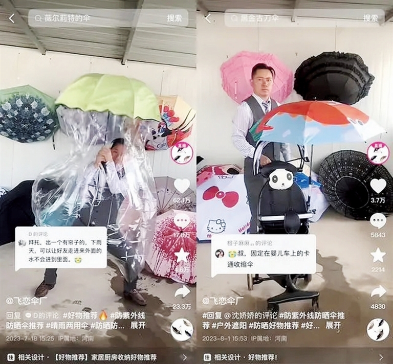 雷鹏琳被网友称为“最听劝”的老板——他在自己的工厂“飞恋伞厂”抖音账号带货,成千上万的网友留言许愿各种千奇百怪的伞:会发光的伞、带幕帘的长伞、独轮滚动伞……
