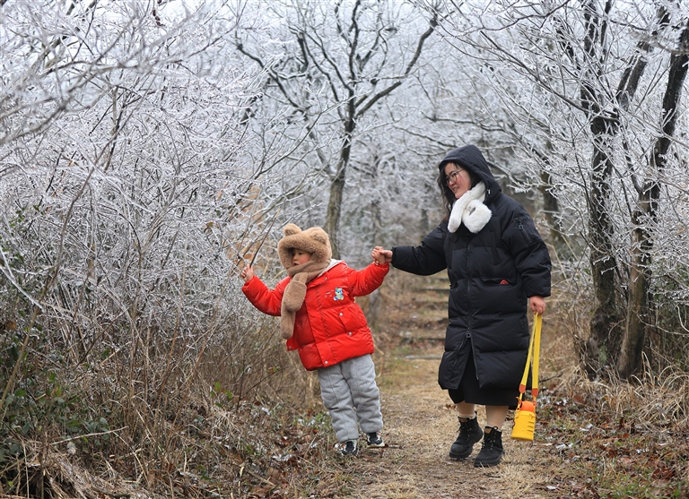 2月25日,定海五雷山顶受到冻雨天气影响出现了雨凇、雾凇等景象,不少游客慕名上山拍照游玩。近段时间的雨水使得我市山间水汽充足,夜间风口处树枝树叶上雾气瞬间凝华成洁白的雾凇,非雪非冰,却比冰雪更加壮美。通讯员 李世浩 摄