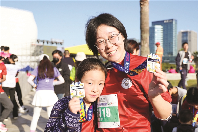 逯平平和女儿王疏影在2023舟山群岛马拉松赛后合影