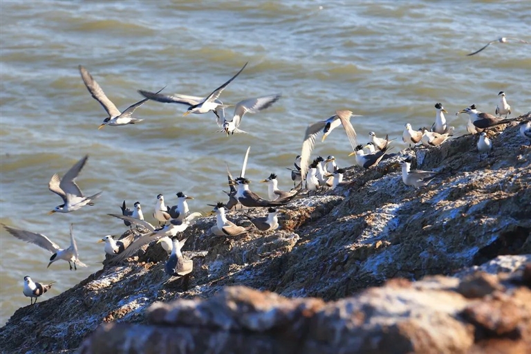 定海五峙山列岛是中华凤头燕鸥重要栖息地,每年5月至10月,数以万计不同种类的水鸟到此停歇、栖息和繁殖,形成千鸟迎宾的壮观景象。