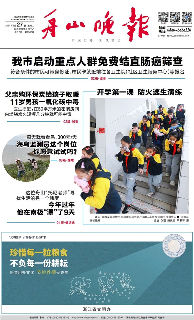 开学季,我市诸多学校上好安全第一课。2月27日《舟山晚报》头版刊登的新闻图片是南海实验学校小学部举行防火逃生演练,孩子们用毛巾捂住口鼻,迅速从楼梯撤离,一丝不苟的模样值得点赞。
