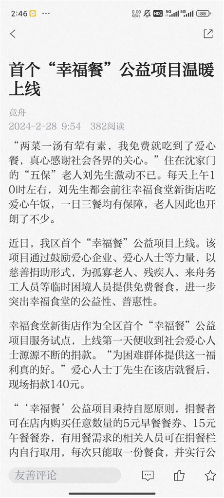 每天上午10时左右,住在沈家门的“五保”老人刘先生都会前往幸福食堂新街店吃爱心午饭,老人因此也开朗了不少。近日,普陀区首个“幸福餐”公益项目上线。这是“幸福餐”帮助有困群体解决就餐困难的一个暖心场景。