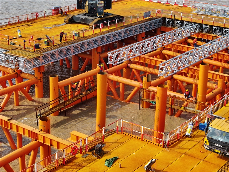昨天下午,在定海区富翅门水道边,一条长96米、宽8米施工栈桥已伸向海中,并搭建完成。据相关负责人介绍,这条施工栈桥是为甬舟铁路富翅门公铁两用大桥建造而搭设。甬舟铁路富翅门公铁两用大桥,主桥长788.6米,主跨388米,是世界最大跨度高低塔公铁两用同层斜拉桥。通讯员 姚峰 祁春寒 摄