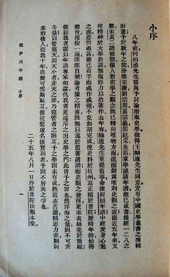 二是在《程伊川年谱小序》文末,提及“二十五年八月一日序于普陀山报本堂”。说明民国二十五年的8月1日,姚名达已经基本完成了书稿,最后写下这篇序言。从时间上看,他在普陀山已经小住了一段时间。他是趁着暑假来普陀山写作度夏,完成一本书的书稿,毕竟至少要十来天吧。从地点看,其所下榻的是报本堂。