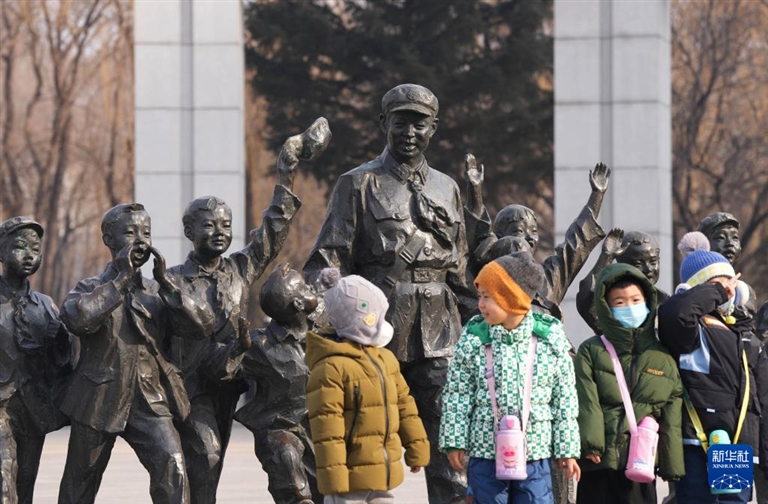 在辽宁抚顺雷锋纪念馆的门前,小朋友和雷锋塑像合影留念。学雷锋纪念日临近,抚顺雷锋纪念馆迎来参观热潮。中新网 图