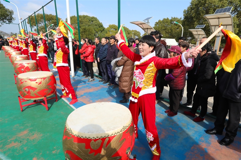 村里锣鼓队为参赛队员擂鼓助威 图/罗沛文
