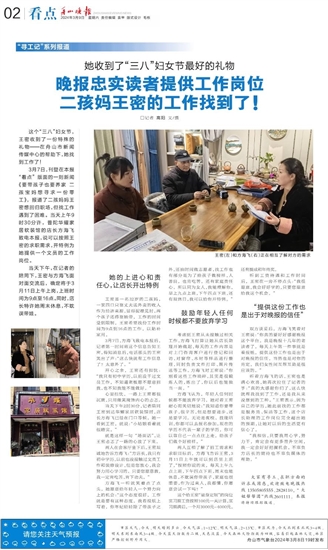晚报忠实读者提供工作岗位 二孩妈王密的工作找到了!